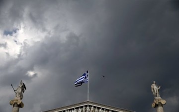 A Greek national flag flutters next to statues of ancient Goddess Athena and God Apollo atop the Athens Academy
